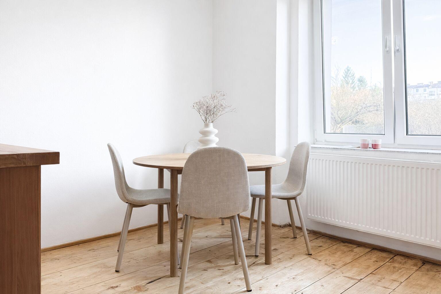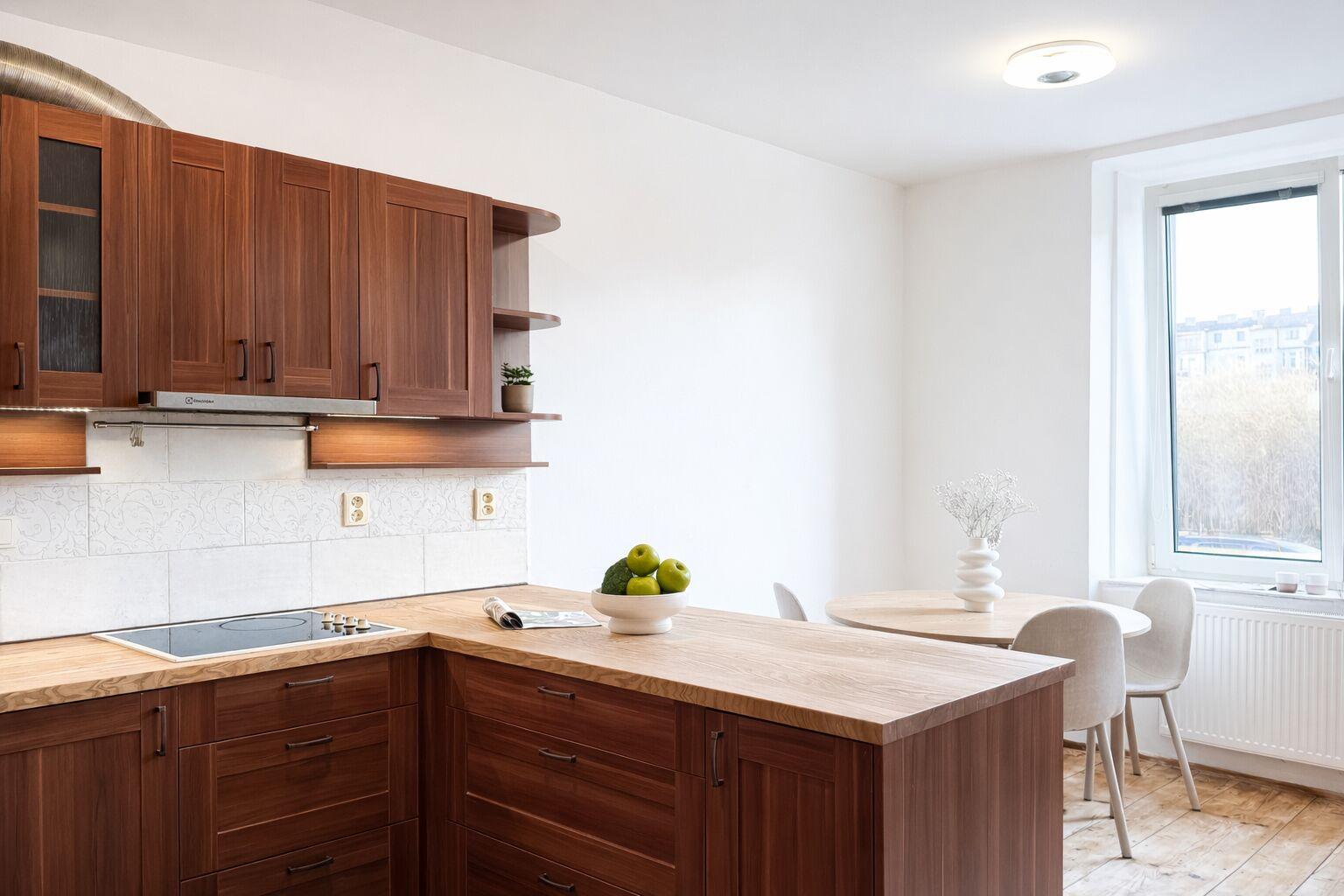 Byt zaujme především příjemnou atmosférou a zajímavou dispozicí, která nabízí velkorysé rozměry jednotlivých pokojů. Dominantou bytu je kuchyně propojená s jídelním koutem, která navazuje na obývací pokoj. Z něj je vstup do dalšího samostatného pokoje, což vytváří praktické a zároveň útulné uspořádání prostoru.