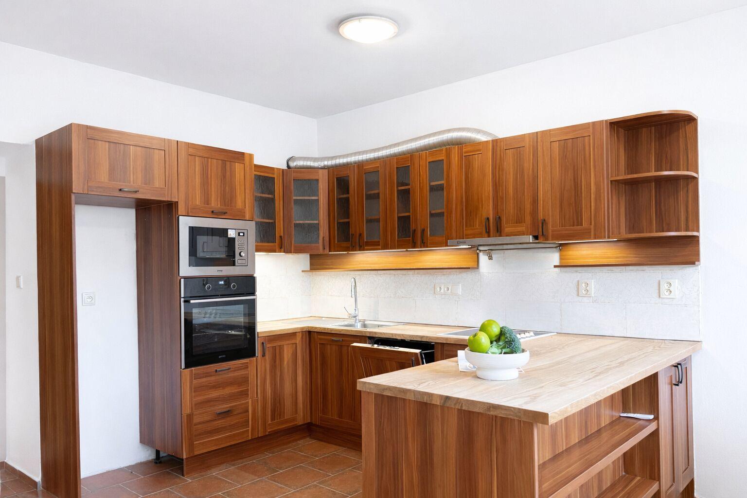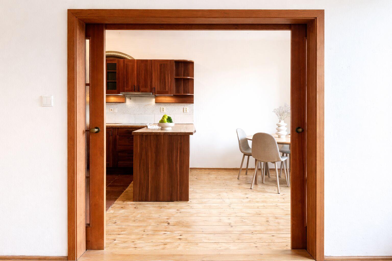 Interiér působí velmi harmonicky díky dřevěným prvkům, pěkným interiérovým dveřím se zárubněmi a podlahám, které dodávají prostoru příjemný charakter.
