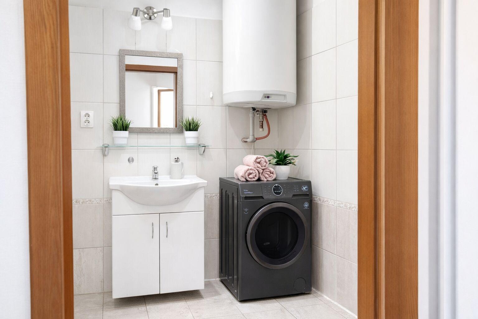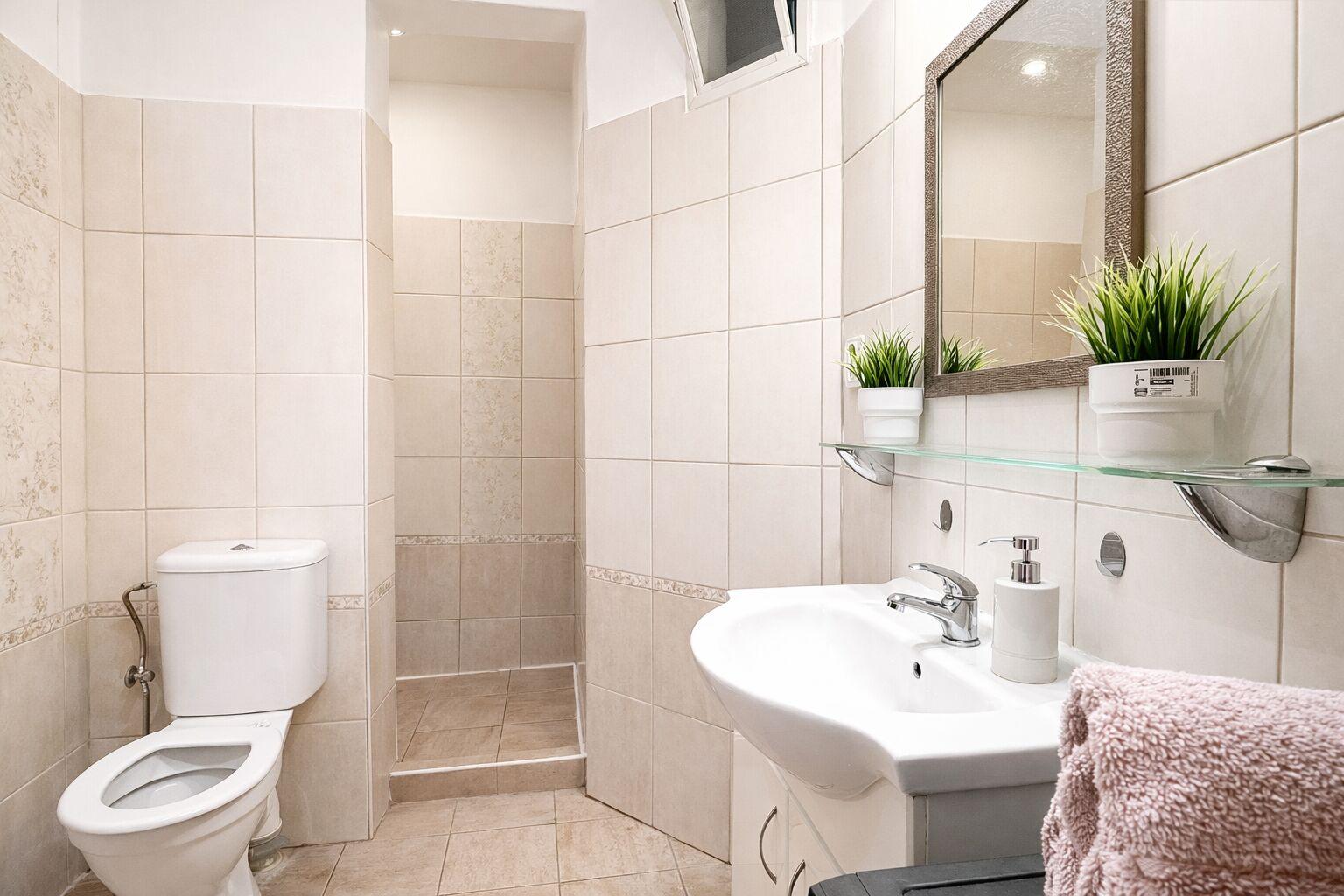 Koupelna je společná s toaletou a je vybavena sprchovým koutem. V koupelně i na chodbě je instalováno podlahové vytápění, které zvyšuje komfort bydlení.