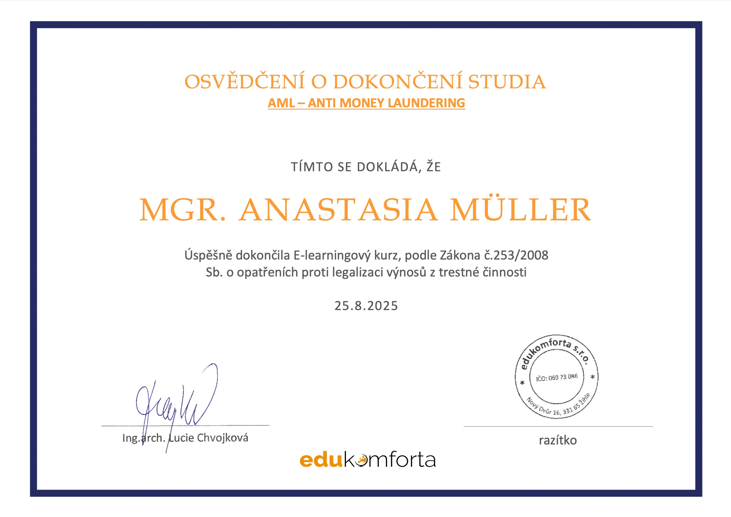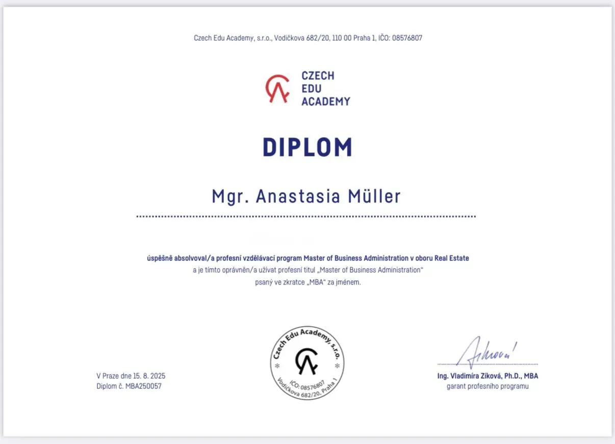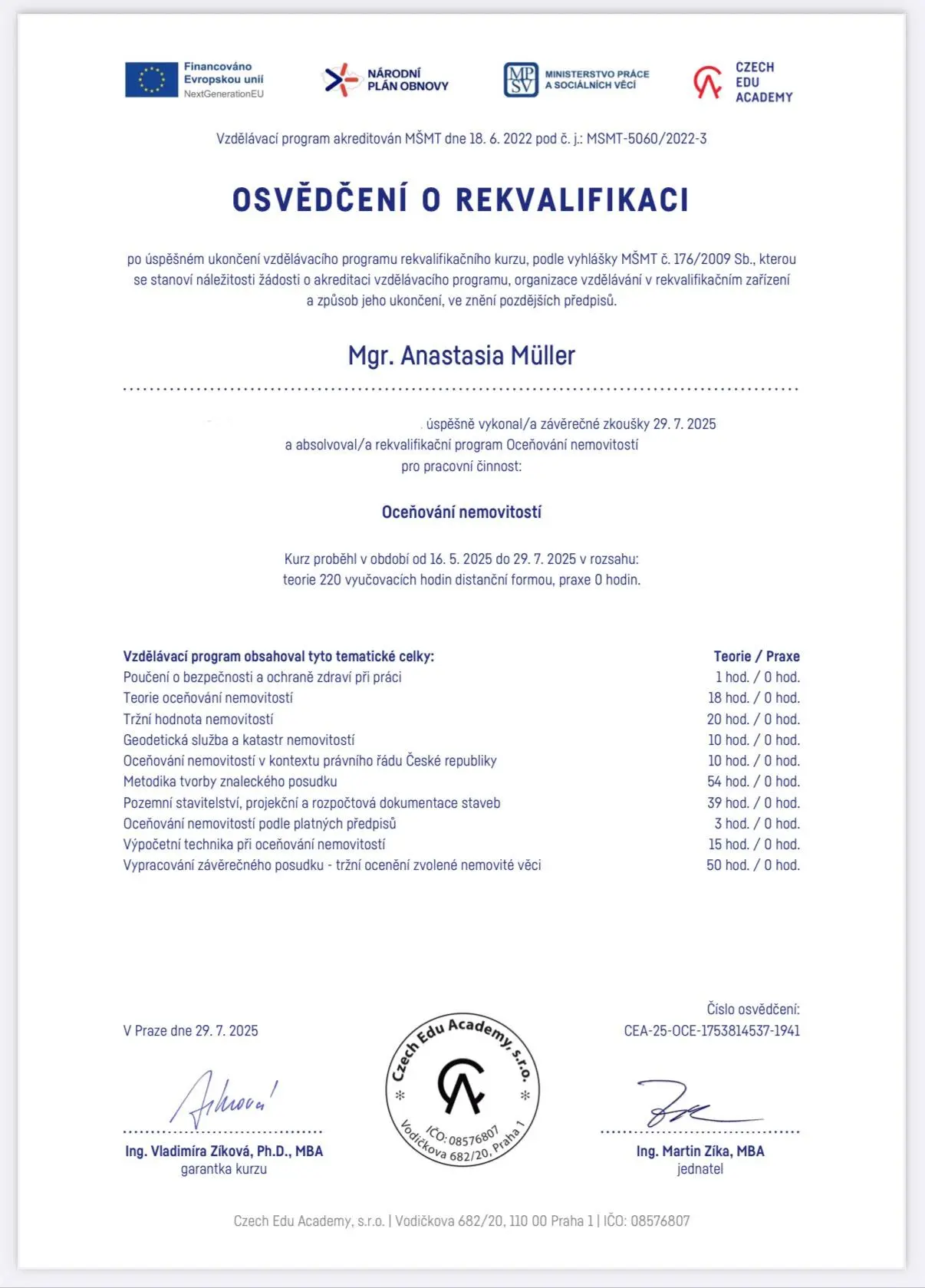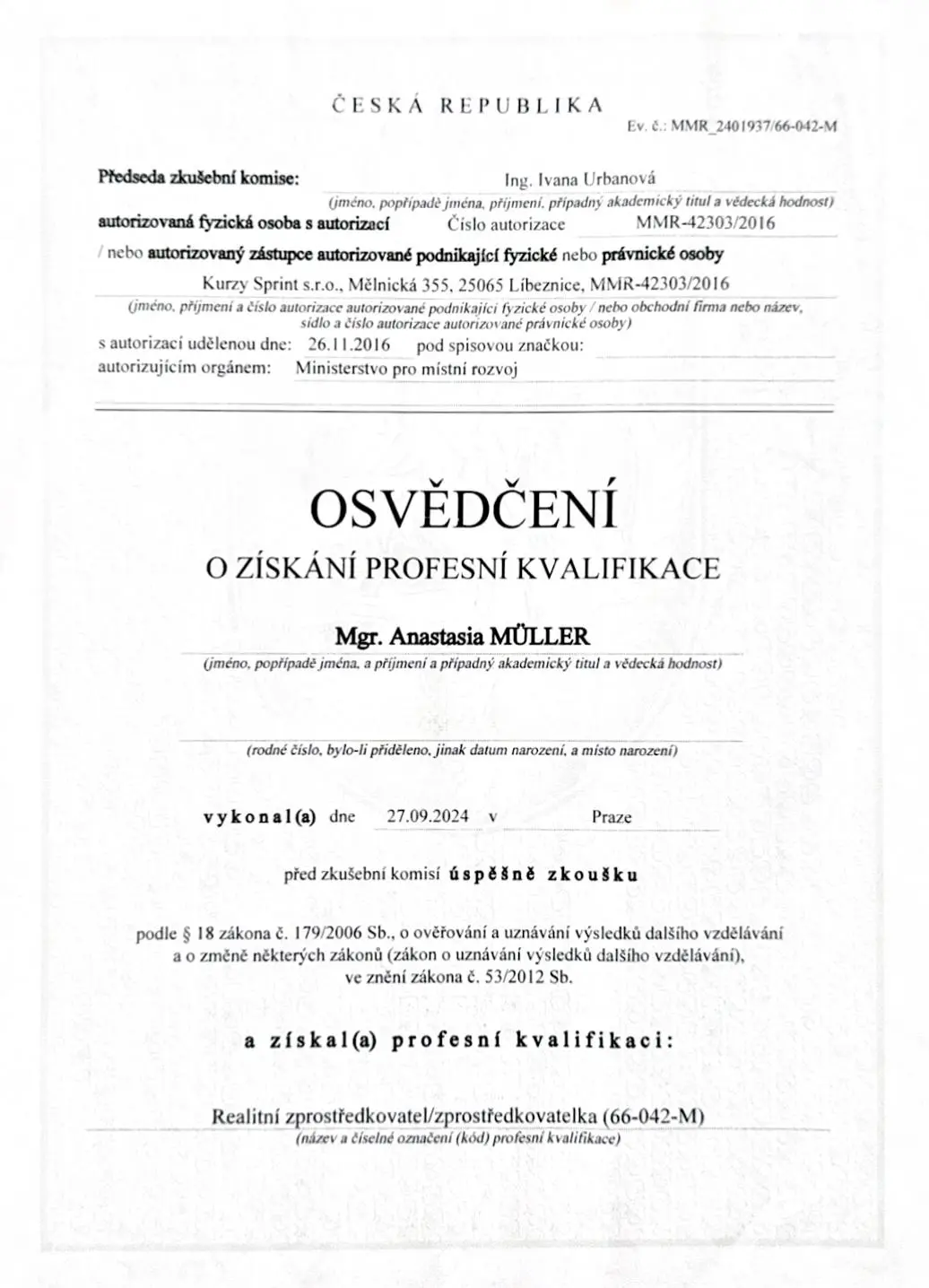 Jsem certifikovaná realitní makléřka působící v Plzeňském kraji a držitelka osvědčení v oboru oceňování nemovitostí. Mám vystudované MBA – Real Estate. Každý prodej či pronájem vedu tak, aby proběhl rychle, bezpečně a bez zbytečného stresu.